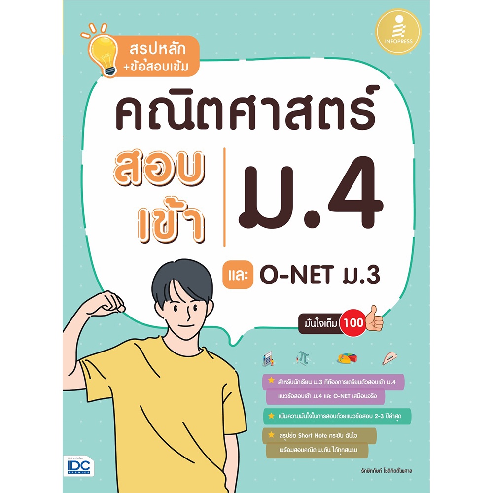 - สรุปหลัก + ข้อสอบเข้มคณิตศาสตร์ สอบเข้า ม.4 และ O-NET ม.3 มั่นใจเต็ม 100” เล่มนี้ จะช่วยให้น้องๆ พัฒนาการทำโจทย์ และการวิเคราะห์โจทย์คณิตในรูปแบบต่างๆ ซึ่งจะเพิ่มคะแนนในการทำข้อสอบได้ภายในระยะเวลาอันสั้น
